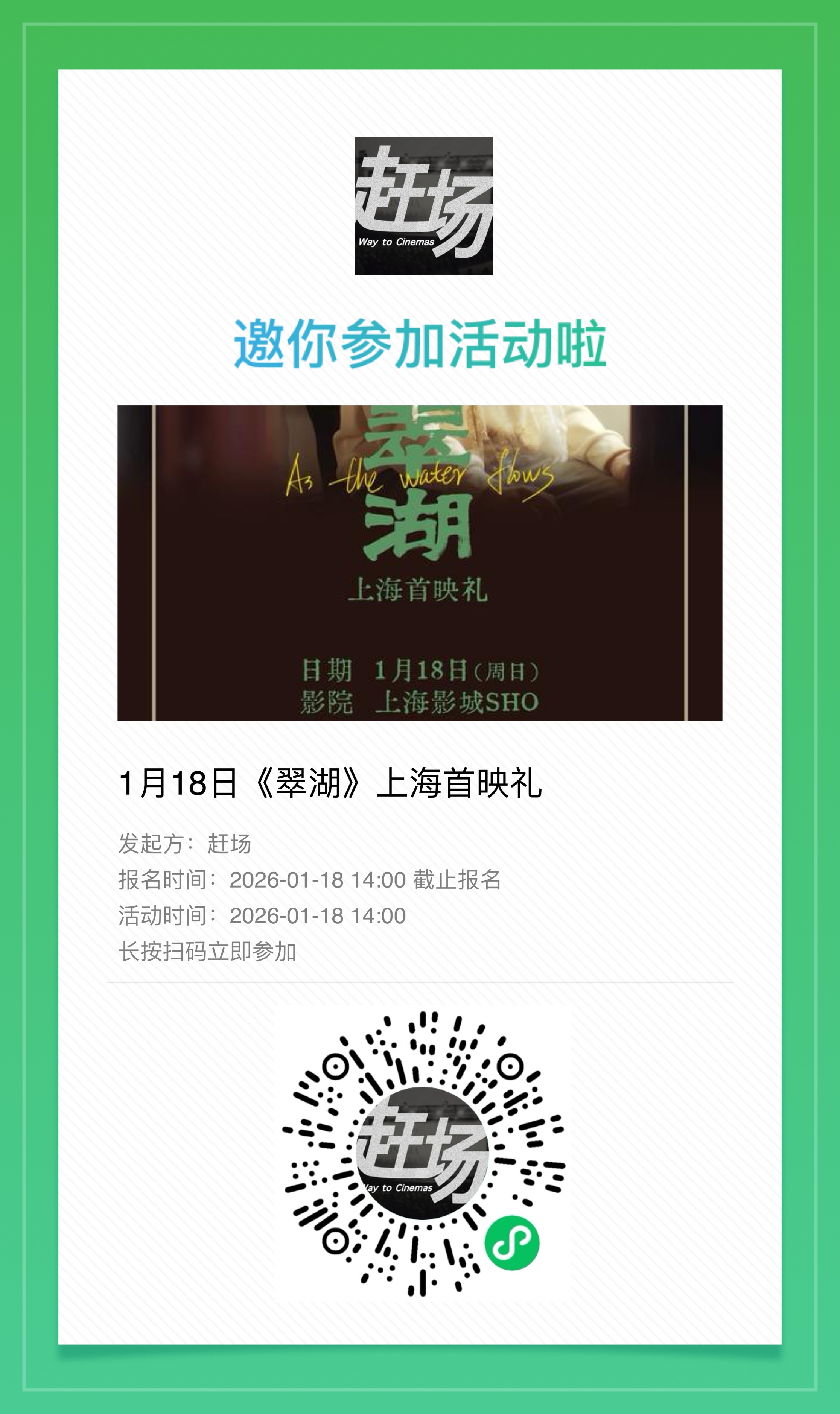 《赶场》第一次开团,18号《翠湖》首映礼,欢迎大家参加哦~
