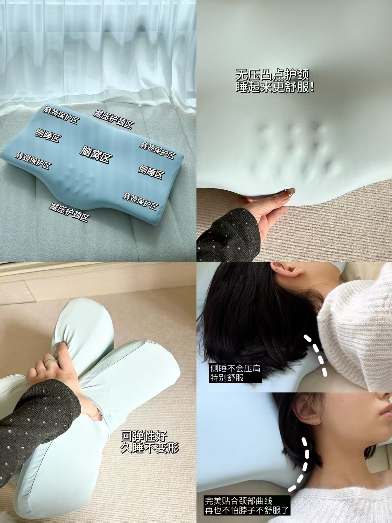 - ✔ 科学分区设计 头部承托,侧睡缓冲,颈椎减压,肩颈保护